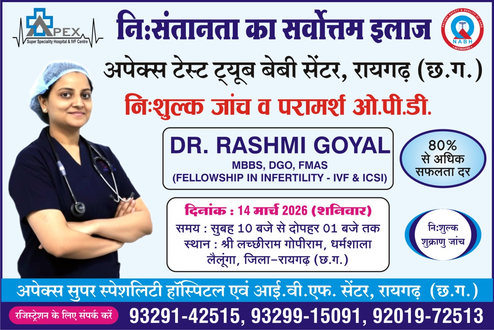 लैलूंगा/रायगढ़। अपेक्स सुपरस्पेशलिटी हॉस्पिटल एवम् आईवीएफ सेंटर रायगढ़ द्वारा आयोजित, निःसंतान दंपतियों के लिए निःशुल्क जांच एवम् परामर्श ओपीडी का आयोजन दिनांक 14 मार्च 2026, दिन शनिवार को श्री लच्छीराम गोपीराम धर्मशाला लैलूंगा, जिला- रायगढ़ (छ.ग.)मे किया जा रहा है जिसमे इनफर्टिलिटी विशेषज्ञ डॉ रश्मि गोयल निःशुल्क जांच एवम् परमर्श हेतु उपलब्ध रहेंगी।