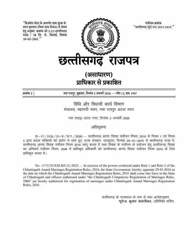 Chhattisgarh News/रायपुर। छत्तीसगढ़ सरकार ने प्रदेश में अब सभी विवाहों का पंजीयन अनिवार्य कर दिया गया है. इस संबंध में विधि और विधायी कार्य विभाग द्वारा आधिकारिक राजपत्र में अधिसूचना प्रकाशित कर दी गई है. यह नियम उन सभी दंपतियों पर प्रभावी होगा, जिनका विवाह 29 जनवरी 2016 या उसके बाद संपन्न हुआ है.