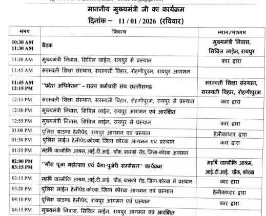 दरअसल, इसके बाद सीएम साय दोपहर 1:00 बजे पुलिस ग्राउंड हेलीपैड से कोरबा के लिए रवाना होंगे. कोरबा में गौरा पूजा महोत्सव और बैगा पूजेरी सम्मेलन में दोपहर 2 बजे शामिल होंगे. शाम 4:15 बजे मुख्यमंत्री निवास पहुंचेंगे.