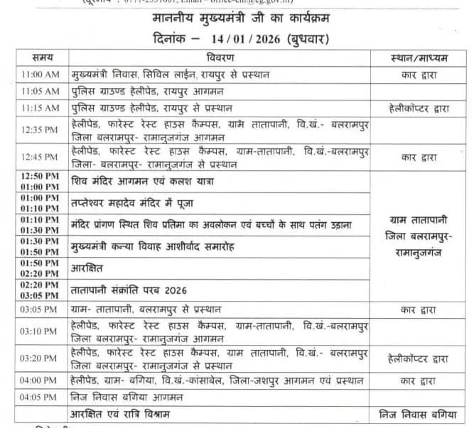 Chhattisgarh News/रायपुर। मुख्यमंत्री विष्णुदेव साय बुधवार को बलरामपुर रामानुजगंज जिले के दौरे पर रहेंगे. जहां वे आयोजित तातापानी महोत्सव में शामिल होंगे. मुख्यमंत्री साय कलश यात्रा और महादेव मंदिर में पूजा अर्चना करेंगे. शिव प्रतिमा का अवलोकन करेंगे.