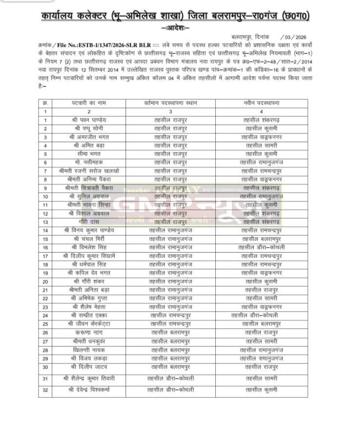 हालांकि, जारी आदेश के अनुसार राजपुर, रामानुजगंज, कुसमी, वाड्रफनगर, शंकरगढ़, रघुनाथनगर और बलरामपुर सहित कई तहसीलों के पटवारियों का एक स्थान से दूसरे स्थान पर स्थानांतरण किया गया है। प्रशासन का कहना है कि इस कदम का उद्देश्य राजस्व व्यवस्था में कसावट लाना, कार्यप्रणाली में पारदर्शिता बढ़ाना और लंबे समय से एक ही जगह पदस्थ कर्मचारियों के कारण बन रही प्रशासनिक ढिलाई को दूर करने के उद्देश्य से उठाया गया है।