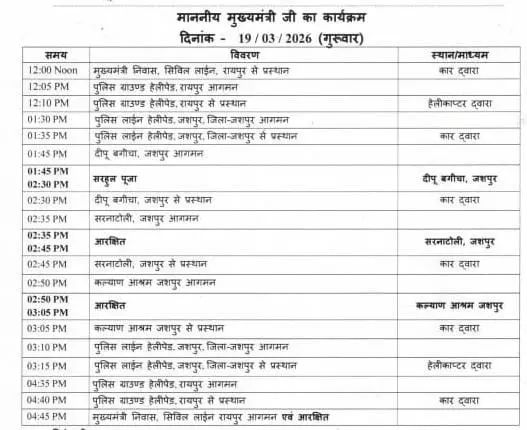 फिलहाल, जशपुर में वे सरहुल पूजा में शामिल होंगे और गृह जिले के विभिन्न कार्यक्रमों में भी भाग लेंगे। शाम 4:30 बजे मुख्यमंत्री रायपुर वापस लौटेंगे।