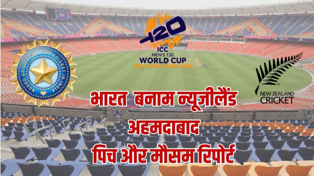 T20 World Cup 2026, India vs New Zealand Match Pitch Report, Narendra Modi Stadium, Ahmedabad: भारत-न्यूजीलैंड टी20 वर्ल्ड कप का फाइनल नरेंद्र स्टेडियम में काली और लाल मिट्टी से बनी पिच पर खेला जाएगा। अहमदाबाद में रविवार को बारिश का अनुमान नहीं है, लेकिन ओस की अह भूमिका हो सकती है।