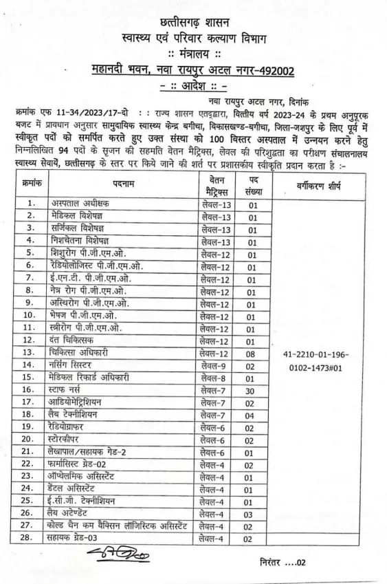 वहीं, राज्य में नई सरकार के गठन के पश्चात मुख्यमंत्री श्री विष्णुदेव साय के स्पष्ट एवं दूरदर्शी सोच के फलस्वरूप उनके निर्देशों के अनुरूप स्वास्थ्य सेवाओं के सुदृढ़ीकरण की दिशा में ठोस पहल की गई। इसी क्रम में वर्ष 2024 में सामुदायिक स्वास्थ्य केंद्र बगीचा को 100 बिस्तरीय अस्पताल के रूप में उन्नयन करने की स्वीकृति प्रदान की गई। इस उन्नयन के तहत शासन द्वारा कुल 94 पदों की स्वीकृति दी गई, जिसमें विशेषज्ञ चिकित्सक, मेडिकल ऑफिसर, नर्सिंग स्टाफ, पैरामेडिकल एवं सहायक पद सम्मिलित हैं। 94 पदों की यह स्वीकृति इस बात का स्पष्ट प्रमाण है कि अस्पताल को पूर्ण रूप से 100 बिस्तरीय स्वास्थ्य सुविधा के रूप में विकसित किया गया है।