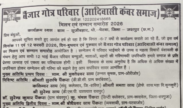 आज से दो दिवसीय बैंजार गोत्र परिवार (आदिवासी कंवर समाज) मिलन एवं सम्मान समारोह सूजीबहार